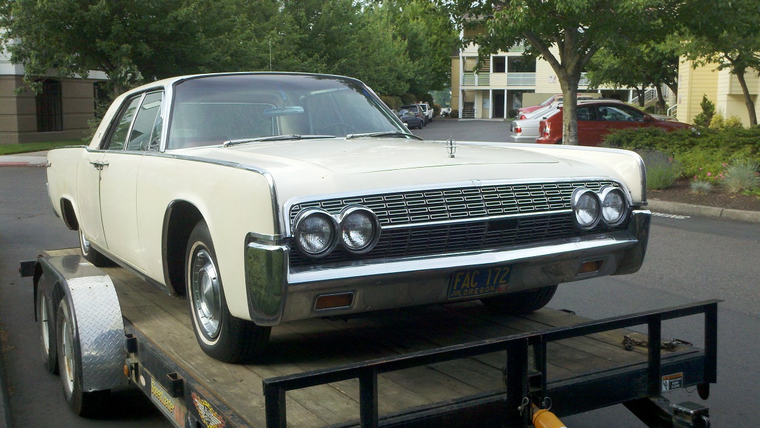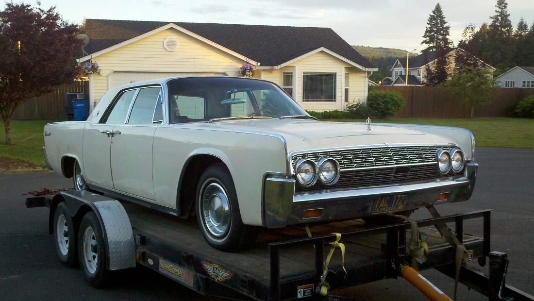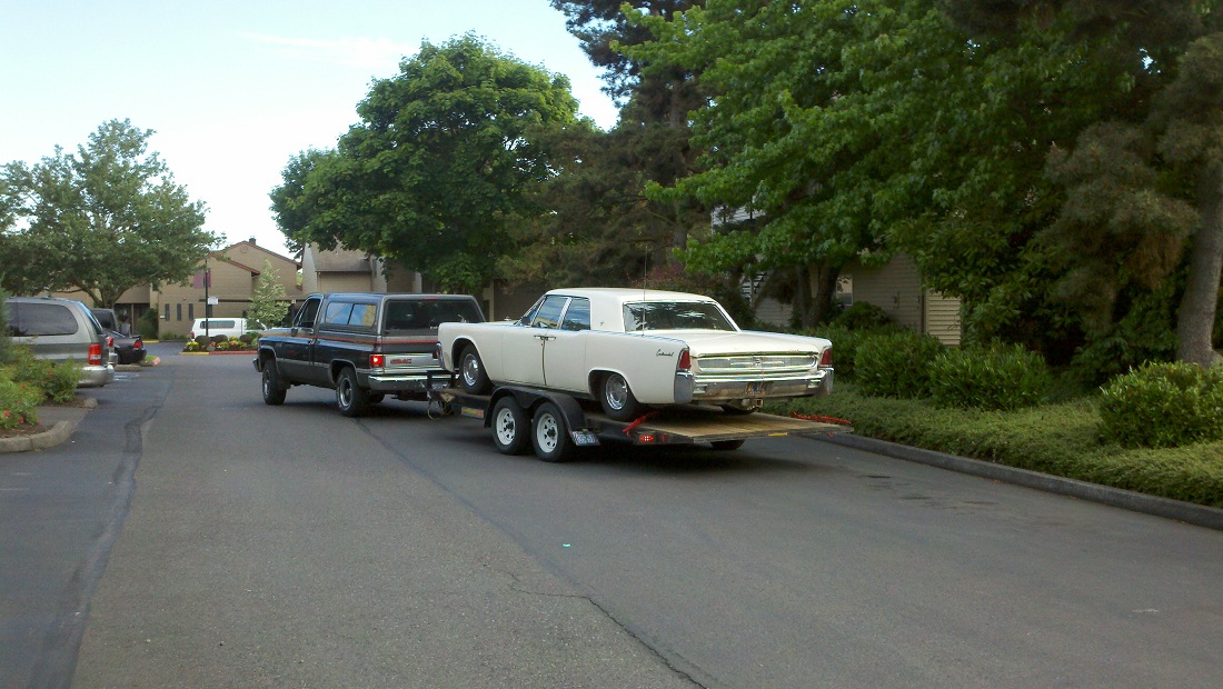 Now that the carb and motor are running strong, we'll be power washing under the hood, replacing all the hoses, and finishing the brakes. Here she is after getting her onto the trailer, and on her way out to my folks place. All is lookin good here. Just need a good detail, pound out dents, new wheels and tires, fix the vacuum powered door locks, and a new paint job, and she'll be clean enough for summer.