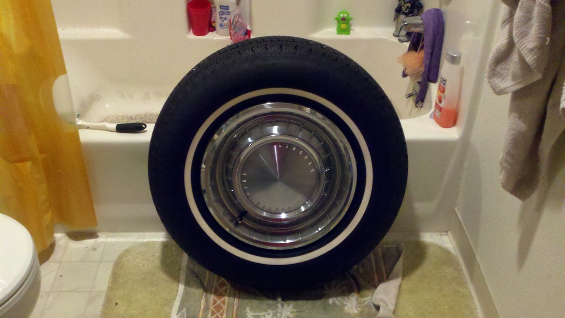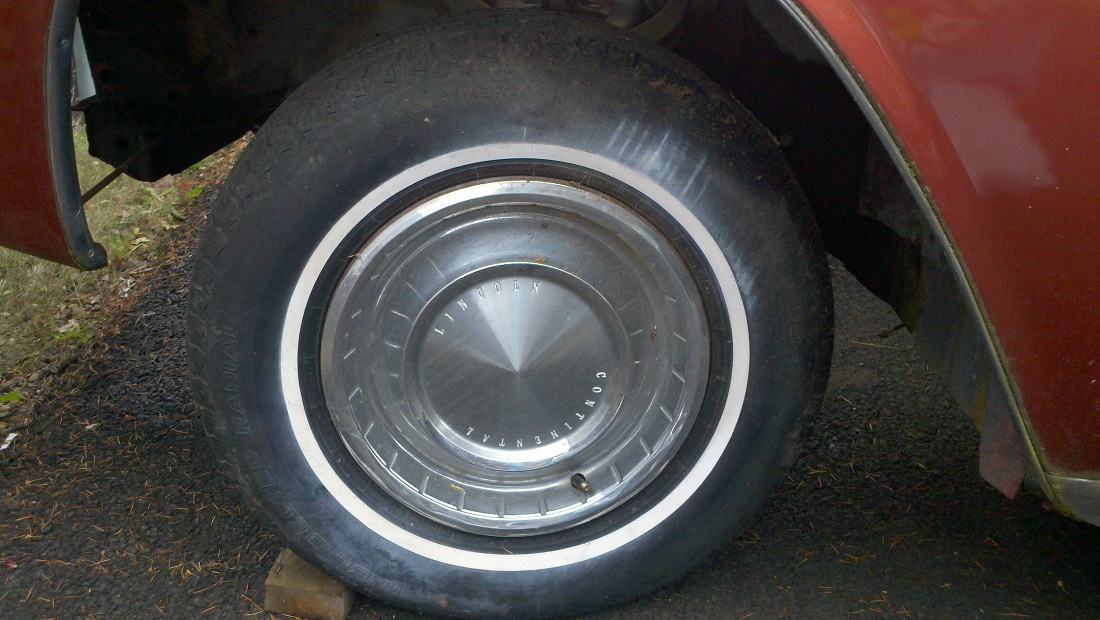 Found some original wheels and hubcaps with nice tires from a collector on Craigslist for $100, and he threw in a right wing window for $25. This was a great find considering I found a set of 4 hubcaps on Ebay for $225. Have to admit they look pretty good on the Lincoln, although I'd like to get a set of 22's with some wide whitewalls when funds permit...