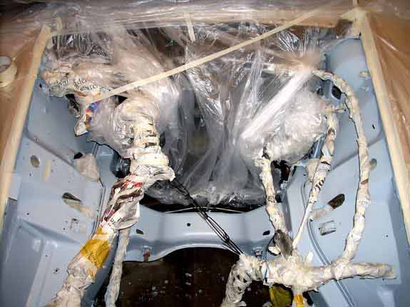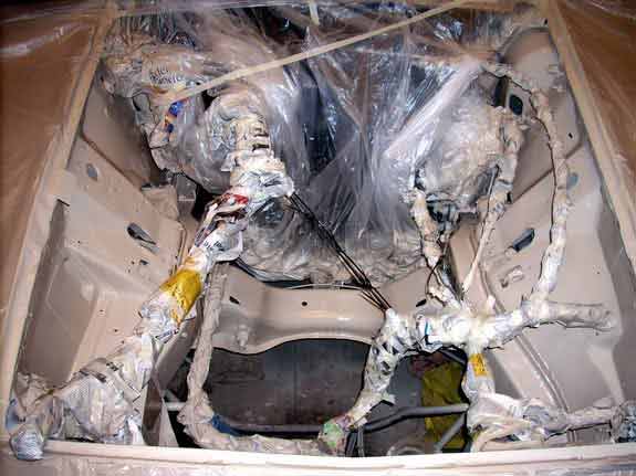 In preparation of a freshly rebuilt engine I've cleaned and resprayed the engine bay. I've not taken it down to bare metal because the factory primer is very good. If hasn't come off at this point it won't come off. Most restorers even leave it on because modern day environmental friendly primers & paints aren't as good. The only rust was surface rust under the battery tray. I painted everything with two coats of POR-15 rust preventive paint and two coats of POR-15 self-etching primer. After that I painted the engine bay with spray cans I had made to match the colour of the exterior.