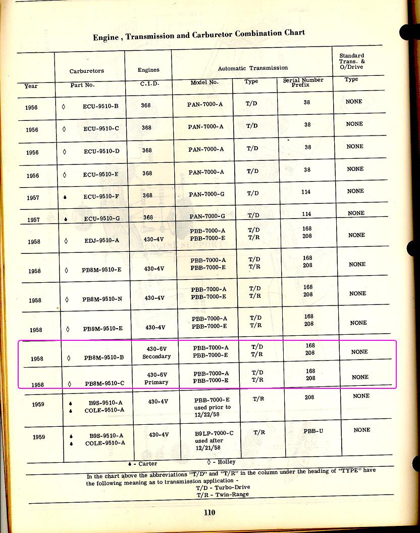 It's not clear to me if the original carburetor numbers in mid-1958 were B8A-9510-B/C or EDG-9510-B/C. They were each around $66 or $68 in 1958. Note: there was no dealer wholesale incentive for EDG-9510-B which leads me to believe that may be the listing for the Secondary carburetor for the Super Marauder. Most of the other carbs, including EDJ-9510-A which is the 430-4V carburetor, had dealer wholesale incentives to move them. An original NOS secondary carb came up on Ebay in 2012. It sold for $675-$700. You can see the original gold iridite finish and number stampings. Holley 2300 Identification